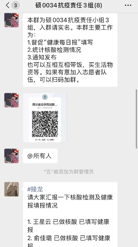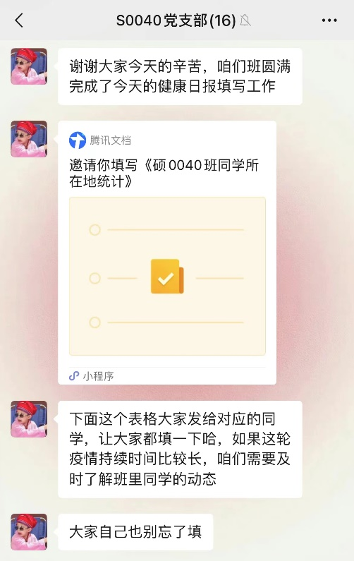 各党支部搭建“党支书-党支委-党员-群众”四级责任体系,各级体系之间紧密对接,保障了重要通知的有效传递。设置“党支部抗疫责任人体系”,确保每位党员和群众都有对应抗疫责任人,号召党员充分发挥先锋模范作用,引导广大党员积极组织班级同学坚持每日健康打卡,高效完成全员核酸检测。
