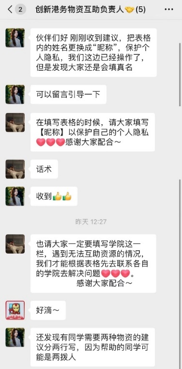 为落实疫情防控工作,根据校园管控要求,避免造成人群拥挤、聚集等情况,每户可两天采购一次并提交购物清单,成立“澎湃配送队”进行制表整理,收集创新港宿舍区学生物资需求,为每户配送选购物品。