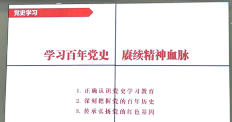 安排,认真组织开展党史学习,支部书记秦浩主讲了“学习百年党史,赓续精神血脉”的专题党课,从正确认识党史学习教育、深刻把握党的百年历史、传承弘扬党的红色基因三个方面,结合党史、新中国史、改革开放史和社会主义发展史,通过重要人物和重大事件的展开,向党员同志们讲解了中国共产党的建立、发展和壮大的光辉历程,阐述了中国共产党的领导是中国特色社会主义的本质特征和最大优势,强调了坚决做到“两个维护”是党的最高政治原则和根本政治规矩,党员同志们认真学习,取得了良好的学习效果。