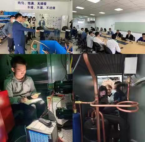随后,9位同学被分为了两组,进行不同的课题研究。一组是对开展制冷系统中蒸发器的设计。在企业实验人员的指导下,同学们根据实验要求布置蒸发器表面的温度传感器,以测量空气的进出口温度和冷媒蒸发温度,通过对节流阀的调节获得满足要求的蒸发温度。二组是开展开展海立转子变频压缩机制冷系统的实验测量工作,主要通过优化双层恒温恒压实验箱的内部结构和各个部件的工作形式,进而解决产品开发的实际问题。