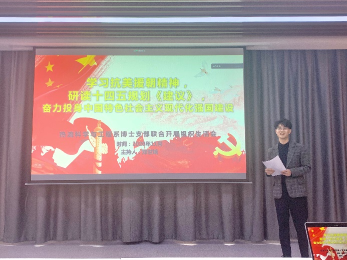 热流科学与工程系4个博士生党支部联合召开以“学习抗美援朝精神,研读十四五规划《建议》,奋力投身中国特色社会主义现代化强国建设”为主题的组织生活会,会议由二支部书记邓世培同志主持,北京赛车pk10