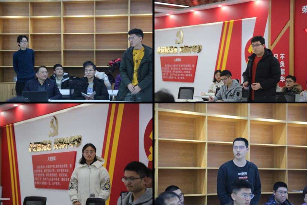 在讨论环节,盖忠睿同志分享自己通过参与课题组前沿项目收获的担当与强烈的爱国信念;李天畅同志分享提到个人的理想信念应与国家发展的大格局结合起来,与祖国同呼吸共命运,才能发挥更大的个人价值;刘兆峥同志结合自身实际分享了自己理解的“两个自信”和“两个机遇”,并立志要夯实专业技能,用“两个自信”面对“两个机遇”。