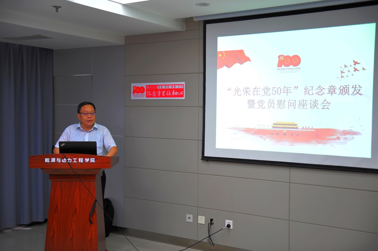 在党50年退休教职工代表徐通模老师说道,中国不能没有共产党!党史的学习让我们对党的认识更加深刻,更加坚定了我们的信念,让我们更加紧密的团结统一在党的领导下。朱继洲老师有65年党龄,讲述了西迁以来自己的成长经历和能动系所的历史,他开心于西安交大今日的上升发展和能动学科排名不断上升,希望西安交通大学在西北这片土地上树立好旗帜,为国家做出贡献。徐廷相老师说道,“没有共产党,就没有我的今天,我一辈子跟党走、听党指挥。”徐老师在党的教导和帮助下,从小下定决心学习党的知识,永远不忘党的教育和培养。江涛老师表达了自豪的心情,他大一时加入中国共产党,受到了党的教育和关怀,党给了自己宽广的胸怀和永不衰竭的动力,动力系的发展、中国的翻天覆地的变化都离不开共产党。“我永远做一个永不褪色的党员”,江涛老师激动的说。