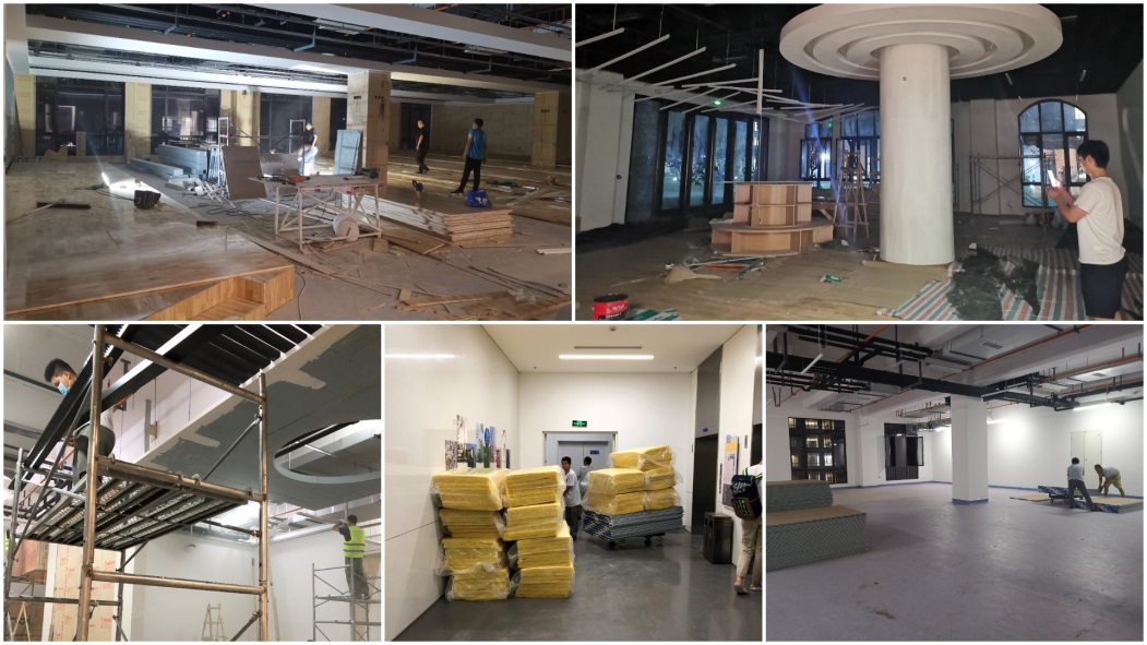 27日晚11点,皎月下,宁静的创新港里,1号巨构灯火通明。4至6楼的研究院展厅、院办办公区、会议中心和保密室的建设工地仍在抓紧工作,负责改造的老师与工人们一起挥汗如雨,加班加点赶进度,为确保月底前完成建设,全力以赴。