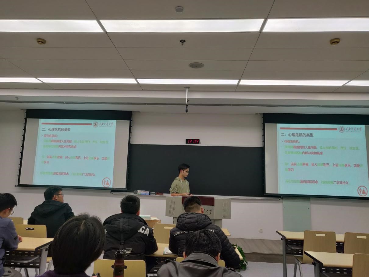 会议开始,心理委员汪楷首先结合PPT及相关资料从专业的角度对心理危机的定义,判别分类等方面进行讲解,让同学们了解到相关的基本知识。接着,为使同学们更进一步的理解讲述内容并对生活科研中可能出现的心理危机做出正确的应对,播放了有关视频。从而让同学们知道如何正确与自己沟通,以及如何走出心理危机。最后,为对班级同学目前的心理状况进行初步了解,汪楷让在会的每个同学写下目前最困扰自己的事或者最想说的话。通过这个方式,不仅能够了解同学们的心理状况,也让同学们体会了如何与自己交流的一种方式。