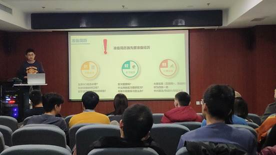 接下来牛璁师兄,签约于小米任项目经理。牛璁师兄首先向大家介绍了如何准备简历,科研成果、实习经历、比赛经历该如何提炼汇总、如何侧重。接着是关于简历投递,如何获得职位信息,简历投递的选择、技巧和方法。